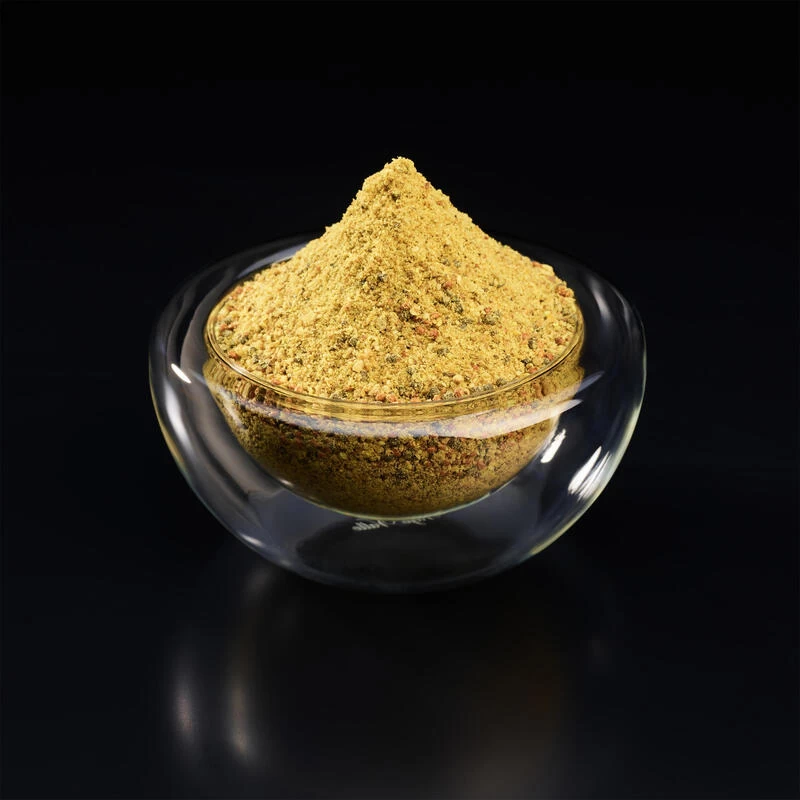 Chapelure, graine de millet roux, pellet (blé, farine de poisson, tourteau de soja, huile de colza, farine de sang, huile de poisson) (7%), maïs, chenevis, noix tigrée, ail (1%), arôme ail (1%)