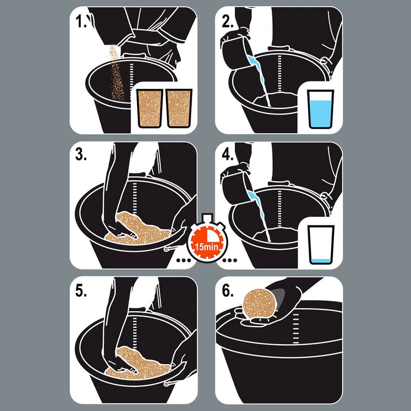 On commence tout d’abord par verser les 3/4 du volume d’eau nécessaire en mélangeant énergétiquement avec la main dans un seau rond pour permettre aux particules de l’amorce de se gorger d’eau.