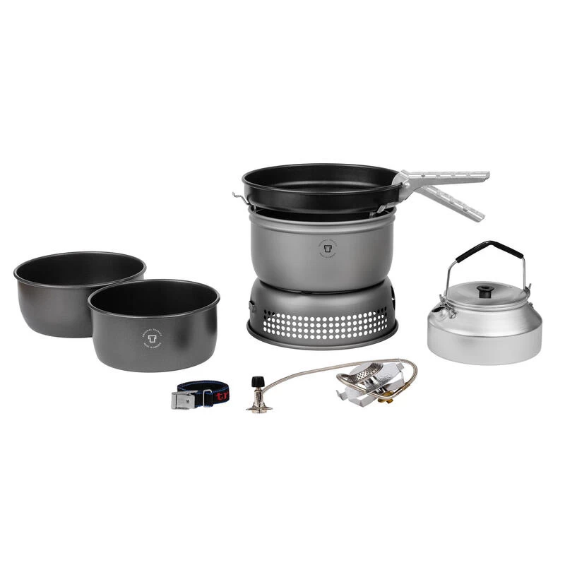 Cet appareil de cuisson Trangia de la série 25-HA est compact et robuste. Comprenant un support de brûleur, un brûleur à alcool/esprit et diverses casseroles.
