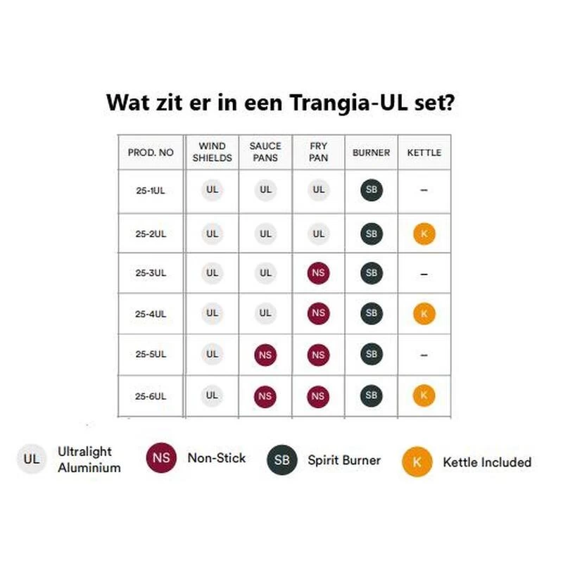 Ensemble de cuisine compact et léger. Complet avec support de brûleur, brûleur à alcool/esprit, deux casseroles de 1 litre (1 avec des lignes de mesure), poêle antiadhésive (18 cm), théière de 0,6 L,